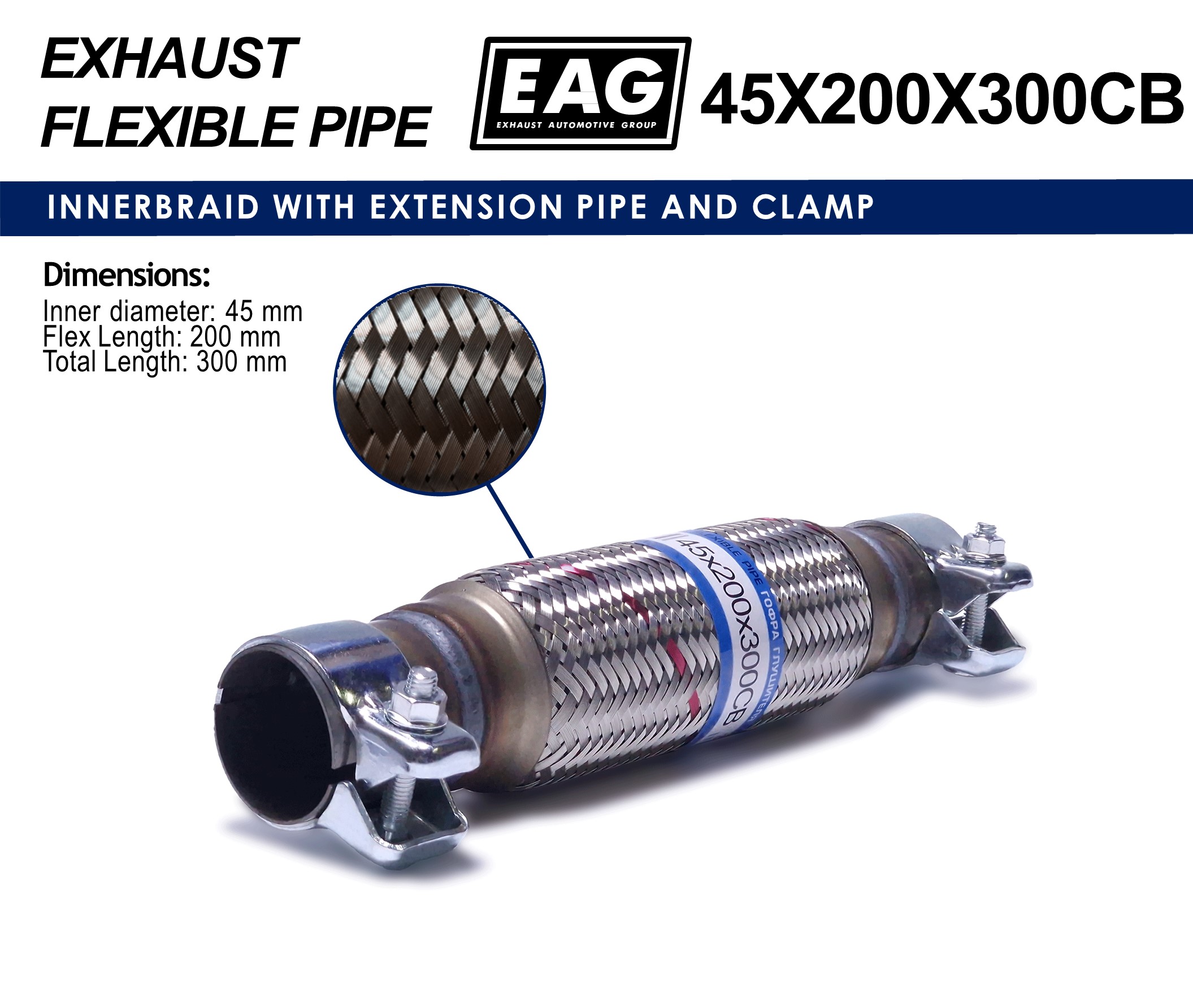 Exhaust Flex Pipe with Extension Tube and Clamp 45x200x300 (INNERBRAID)