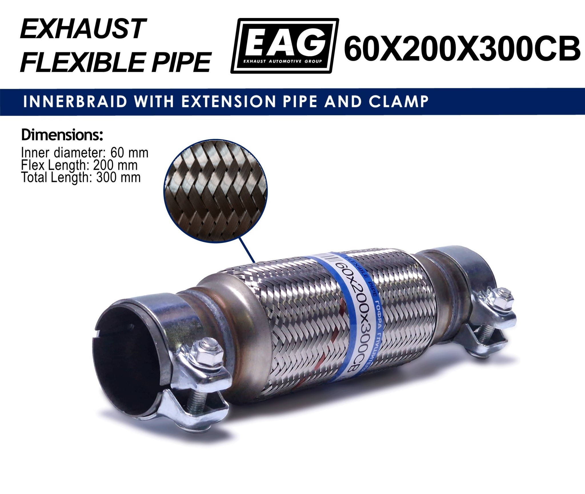 Exhaust Flex Pipe with Extension Tube and Clamp 60x200x300 (INNERBRAID)